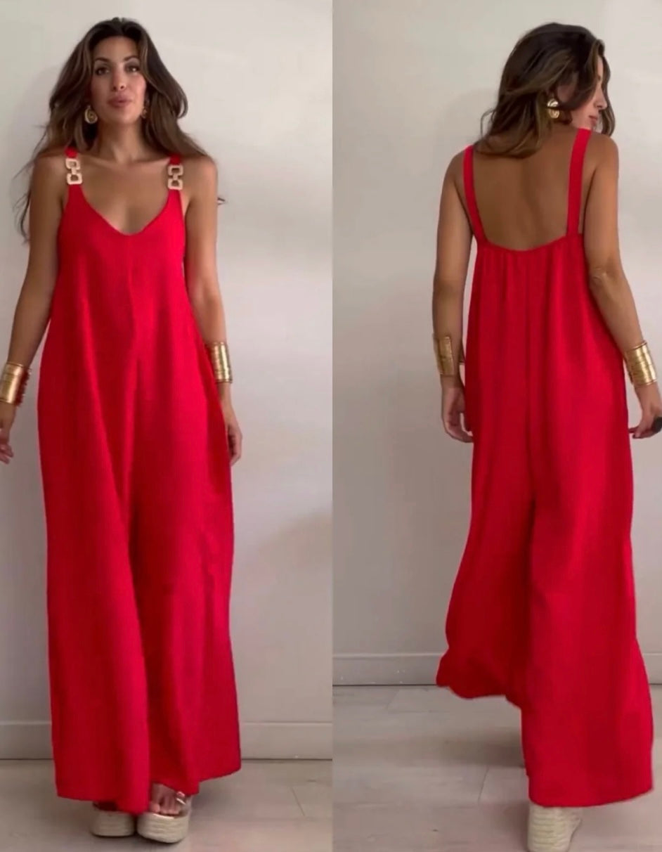 Imagine vestir um conjunto tão fácil como bonito, que a faça sentir-se maravilhosa e completamente livre. O macacão Daphne foi concebido para lhe proporcionar exatamente essa sensação. É sem mangas e maravilhosamente arejado, perfeito para os dias mais quentes, com um bonito decote profundo e um design especial de alça com fivela que acrescenta um toque único. Este macacão permite-lhe desfrutar de cada momento sentindo-se leve, confortável e absolutamente deslumbrante, sem esforço.